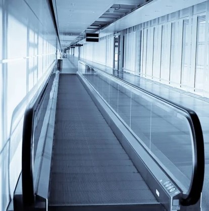 A travelator, also known as a moving walkway, consists of a flat conveyor belt that moves continuously in a loop, driven by an electric motor. Passengers can stand or walk on the travelator, and the belt moves at a constant speed, typically between 0.5 to 1 meter per second.